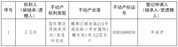 根据《不动产登记暂行条例实施细则》第十四条的规定,经初步查验,不动产登记机构拟对下列不动产权利办理不动产继承登记。根据《不动产登记暂行条例实施细则》第十七条的规定,现予公告。如有异议,请自本公告之日起15个工作日内,将异议书面材料送达不动产登记机构。逾期无人提出异议或者异议不成立的,不动产登记机构将予以登记。