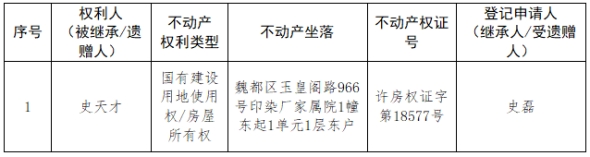 根据《不动产登记暂行条例实施细则》第十四条的规定,经初步查验,不动产登记机构拟对下列不动产权利办理不动产继承登记。根据《不动产登记暂行条例实施细则》第十七条的规定,现予公告。如有异议,请自本公告之日起15个工作日内,将异议书面材料送达不动产登记机构。逾期无人提出异议或者异议不成立的,不动产登记机构将予以登记。