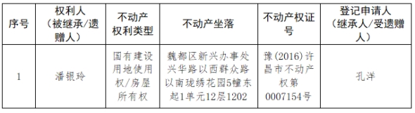 根据《不动产登记暂行条例实施细则》第十四条的规定,经初步查验,不动产登记机构拟对下列不动产权利办理不动产继承登记。根据《不动产登记暂行条例实施细则》第十七条的规定,现予公告。如有异议,请自本公告之日起15个工作日内,将异议书面材料送达不动产登记机构。逾期无人提出异议或者异议不成立的,不动产登记机构将予以登记。