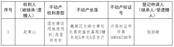 根据《不动产登记暂行条例实施细则》第十四条的规定,经初步查验,不动产登记机构拟对下列不动产权利办理不动产继承登记。根据《不动产登记暂行条例实施细则》第十七条的规定,现予公告。如有异议,请自本公告之日起15个工作日内,将异议书面材料送达不动产登记机构。逾期无人提出异议或者异议不成立的,不动产登记机构将予以登记。