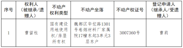 根据《不动产登记暂行条例实施细则》第十四条的规定,经初步查验,不动产登记机构拟对下列不动产权利办理不动产继承登记。根据《不动产登记暂行条例实施细则》第十七条的规定,现予公告。如有异议,请自本公告之日起15个工作日内,将异议书面材料送达不动产登记机构。逾期无人提出异议或者异议不成立的,不动产登记机构将予以登记。
