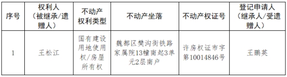 根据《不动产登记暂行条例实施细则》第十四条的规定,经初步查验,不动产登记机构拟对下列不动产权利办理不动产继承登记。根据《不动产登记暂行条例实施细则》第十七条的规定,现予公告。如有异议,请自本公告之日起15个工作日内,将异议书面材料送达不动产登记机构。逾期无人提出异议或者异议不成立的,不动产登记机构将予以登记。