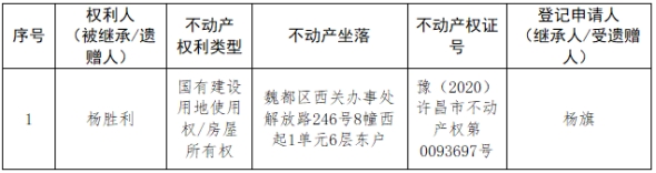 根据《不动产登记暂行条例实施细则》第十四条的规定,经初步查验,不动产登记机构拟对下列不动产权利办理不动产继承登记。根据《不动产登记暂行条例实施细则》第十七条的规定,现予公告。如有异议,请自本公告之日起15个工作日内,将异议书面材料送达不动产登记机构。逾期无人提出异议或者异议不成立的,不动产登记机构将予以登记。