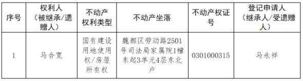 根据《不动产登记暂行条例实施细则》第十四条的规定,经初步查验,不动产登记机构拟对下列不动产权利办理不动产继承登记。根据《不动产登记暂行条例实施细则》第十七条的规定,现予公告。如有异议,请自本公告之日起15个工作日内,将异议书面材料送达不动产登记机构。逾期无人提出异议或者异议不成立的,不动产登记机构将予以登记。