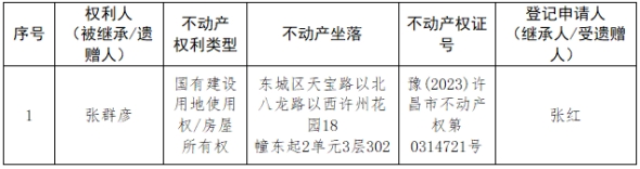 根据《不动产登记暂行条例实施细则》第十四条的规定,经初步查验,不动产登记机构拟对下列不动产权利办理不动产继承登记。根据《不动产登记暂行条例实施细则》第十七条的规定,现予公告。如有异议,请自本公告之日起15个工作日内,将异议书面材料送达不动产登记机构。逾期无人提出异议或者异议不成立的,不动产登记机构将予以登记。