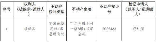 根据《不动产登记暂行条例实施细则》第十四条的规定,经初步查验,不动产登记机构拟对下列不动产权利办理不动产继承登记。根据《不动产登记暂行条例实施细则》第十七条的规定,现予公告。如有异议,请自本公告之日起15个工作日内,将异议书面材料送达不动产登记机构。逾期无人提出异议或者异议不成立的,不动产登记机构将予以登记。