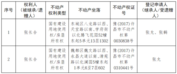 根据《不动产登记暂行条例实施细则》第十四条的规定,经初步查验,不动产登记机构拟对下列不动产权利办理不动产继承登记。根据《不动产登记暂行条例实施细则》第十七条的规定,现予公告。如有异议,请自本公告之日起15个工作日内,将异议书面材料送达不动产登记机构。逾期无人提出异议或者异议不成立的,不动产登记机构将予以登记。