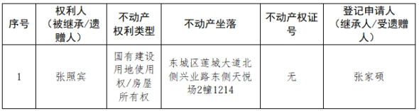 根据《不动产登记暂行条例实施细则》第十四条的规定,经初步查验,不动产登记机构拟对下列不动产权利办理不动产继承登记。根据《不动产登记暂行条例实施细则》第十七条的规定,现予公告。如有异议,请自本公告之日起15个工作日内,将异议书面材料送达不动产登记机构。逾期无人提出异议或者异议不成立的,不动产登记机构将予以登记。