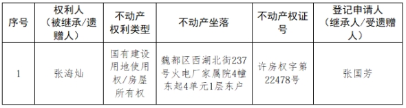 根据《不动产登记暂行条例实施细则》第十四条的规定,经初步查验,不动产登记机构拟对下列不动产权利办理不动产继承登记。根据《不动产登记暂行条例实施细则》第十七条的规定,现予公告。如有异议,请自本公告之日起15个工作日内,将异议书面材料送达不动产登记机构。逾期无人提出异议或者异议不成立的,不动产登记机构将予以登记。
