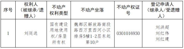 根据《不动产登记暂行条例实施细则》第十四条的规定,经初步查验,不动产登记机构拟对下列不动产权利办理不动产继承登记。根据《不动产登记暂行条例实施细则》第十七条的规定,现予公告。如有异议,请自本公告之日起15个工作日内,将异议书面材料送达不动产登记机构。逾期无人提出异议或者异议不成立的,不动产登记机构将予以登记。