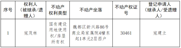 根据《不动产登记暂行条例实施细则》第十四条的规定,经初步查验,不动产登记机构拟对下列不动产权利办理不动产继承登记。根据《不动产登记暂行条例实施细则》第十七条的规定,现予公告。如有异议,请自本公告之日起15个工作日内,将异议书面材料送达不动产登记机构。逾期无人提出异议或者异议不成立的,不动产登记机构将予以登记。
