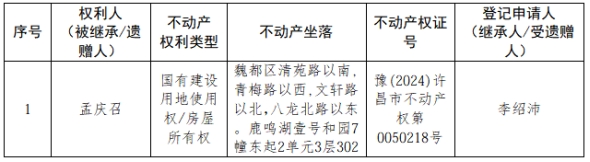 根据《不动产登记暂行条例实施细则》第十四条的规定,经初步查验,不动产登记机构拟对下列不动产权利办理不动产继承登记。根据《不动产登记暂行条例实施细则》第十七条的规定,现予公告。如有异议,请自本公告之日起15个工作日内,将异议书面材料送达不动产登记机构。逾期无人提出异议或者异议不成立的,不动产登记机构将予以登记。
