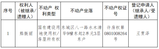 根据《不动产登记暂行条例实施细则》第十四条的规定,经初步查验,不动产登记机构拟对下列不动产权利办理不动产继承登记。根据《不动产登记暂行条例实施细则》第十七条的规定,现予公告。如有异议,请自本公告之日起15个工作日内,将异议书面材料送达不动产登记机构。逾期无人提出异议或者异议不成立的,不动产登记机构将予以登记。