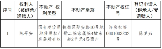 根据《不动产登记暂行条例实施细则》第十四条的规定,经初步查验,不动产登记机构拟对下列不动产权利办理不动产继承登记。根据《不动产登记暂行条例实施细则》第十七条的规定,现予公告。如有异议,请自本公告之日起15个工作日内,将异议书面材料送达不动产登记机构。逾期无人提出异议或者异议不成立的,不动产登记机构将予以登记。