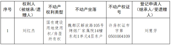 根据《不动产登记暂行条例实施细则》第十四条的规定,经初步查验,不动产登记机构拟对下列不动产权利办理不动产继承登记。根据《不动产登记暂行条例实施细则》第十七条的规定,现予公告。如有异议,请自本公告之日起15个工作日内,将异议书面材料送达不动产登记机构。逾期无人提出异议或者异议不成立的,不动产登记机构将予以登记。