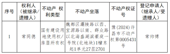 根据《不动产登记暂行条例实施细则》第十四条的规定,经初步查验,不动产登记机构拟对下列不动产权利办理不动产继承登记。根据《不动产登记暂行条例实施细则》第十七条的规定,现予公告。如有异议,请自本公告之日起15个工作日内,将异议书面材料送达不动产登记机构。逾期无人提出异议或者异议不成立的,不动产登记机构将予以登记。