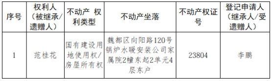根据《不动产登记暂行条例实施细则》第十四条的规定,经初步查验,不动产登记机构拟对下列不动产权利办理不动产继承登记。根据《不动产登记暂行条例实施细则》第十七条的规定,现予公告。如有异议,请自本公告之日起15个工作日内,将异议书面材料送达不动产登记机构。逾期无人提出异议或者异议不成立的,不动产登记机构将予以登记。