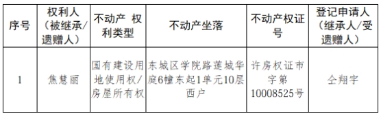 根据《不动产登记暂行条例实施细则》第十四条的规定,经初步查验,不动产登记机构拟对下列不动产权利办理不动产继承登记。根据《不动产登记暂行条例实施细则》第十七条的规定,现予公告。如有异议,请自本公告之日起15个工作日内,将异议书面材料送达不动产登记机构。逾期无人提出异议或者异议不成立的,不动产登记机构将予以登记。