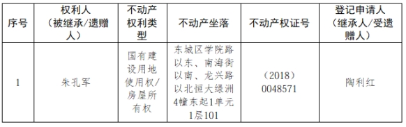 根据《不动产登记暂行条例实施细则》第十四条的规定,经初步查验,不动产登记机构拟对下列不动产权利办理不动产继承登记。根据《不动产登记暂行条例实施细则》第十七条的规定,现予公告。如有异议,请自本公告之日起15个工作日内,将异议书面材料送达不动产登记机构。逾期无人提出异议或者异议不成立的,不动产登记机构将予以登记。