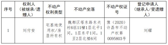 根据《不动产登记暂行条例实施细则》第十四条的规定,经初步查验,不动产登记机构拟对下列不动产权利办理不动产继承登记。根据《不动产登记暂行条例实施细则》第十七条的规定,现予公告。如有异议,请自本公告之日起15个工作日内,将异议书面材料送达不动产登记机构。逾期无人提出异议或者异议不成立的,不动产登记机构将予以登记。