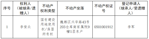 根据《不动产登记暂行条例实施细则》第十四条的规定,经初步查验,不动产登记机构拟对下列不动产权利办理不动产继承登记。根据《不动产登记暂行条例实施细则》第十七条的规定,现予公告。如有异议,请自本公告之日起15个工作日内,将异议书面材料送达不动产登记机构。逾期无人提出异议或者异议不成立的,不动产登记机构将予以登记。