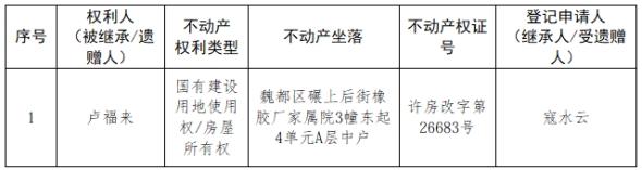 根据《不动产登记暂行条例实施细则》第十四条的规定,经初步查验,不动产登记机构拟对下列不动产权利办理不动产继承登记。根据《不动产登记暂行条例实施细则》第十七条的规定,现予公告。如有异议,请自本公告之日起15个工作日内,将异议书面材料送达不动产登记机构。逾期无人提出异议或者异议不成立的,不动产登记机构将予以登记。