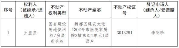 根据《不动产登记暂行条例实施细则》第十四条的规定,经初步查验,不动产登记机构拟对下列不动产权利办理不动产继承登记。根据《不动产登记暂行条例实施细则》第十七条的规定,现予公告。如有异议,请自本公告之日起15个工作日内,将异议书面材料送达不动产登记机构。逾期无人提出异议或者异议不成立的,不动产登记机构将予以登记。