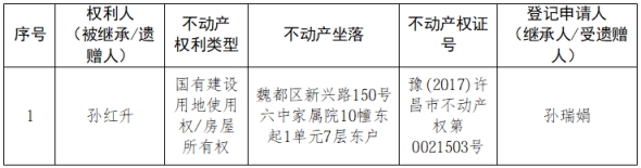 根据《不动产登记暂行条例实施细则》第十四条的规定,经初步查验,不动产登记机构拟对下列不动产权利办理不动产继承登记。根据《不动产登记暂行条例实施细则》第十七条的规定,现予公告。如有异议,请自本公告之日起15个工作日内,将异议书面材料送达不动产登记机构。逾期无人提出异议或者异议不成立的,不动产登记机构将予以登记。