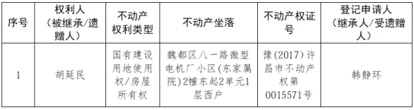 根据《不动产登记暂行条例实施细则》第十四条的规定,经初步查验,不动产登记机构拟对下列不动产权利办理不动产继承登记。根据《不动产登记暂行条例实施细则》第十七条的规定,现予公告。如有异议,请自本公告之日起15个工作日内,将异议书面材料送达不动产登记机构。逾期无人提出异议或者异议不成立的,不动产登记机构将予以登记。