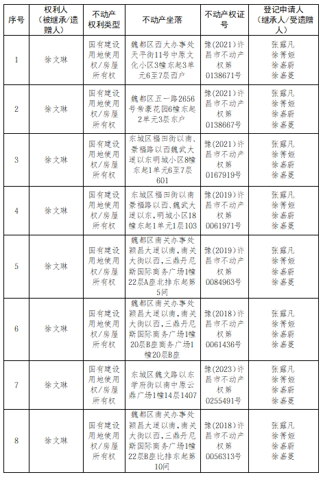 根据《不动产登记暂行条例实施细则》第十四条的规定,经初步查验,不动产登记机构拟对下列不动产权利办理不动产继承登记。根据《不动产登记暂行条例实施细则》第十七条的规定,现予公告。如有异议,请自本公告之日起15个工作日内,将异议书面材料送达不动产登记机构。逾期无人提出异议或者异议不成立的,不动产登记机构将予以登记。