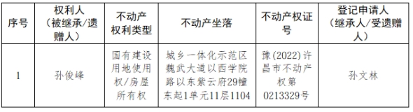 根据《不动产登记暂行条例实施细则》第十四条的规定,经初步查验,不动产登记机构拟对下列不动产权利办理不动产继承登记。根据《不动产登记暂行条例实施细则》第十七条的规定,现予公告。如有异议,请自本公告之日起15个工作日内,将异议书面材料送达不动产登记机构。逾期无人提出异议或者异议不成立的,不动产登记机构将予以登记。