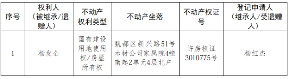 根据《不动产登记暂行条例实施细则》第十四条的规定,经初步查验,不动产登记机构拟对下列不动产权利办理不动产继承登记。根据《不动产登记暂行条例实施细则》第十七条的规定,现予公告。如有异议,请自本公告之日起15个工作日内,将异议书面材料送达不动产登记机构。逾期无人提出异议或者异议不成立的,不动产登记机构将予以登记。