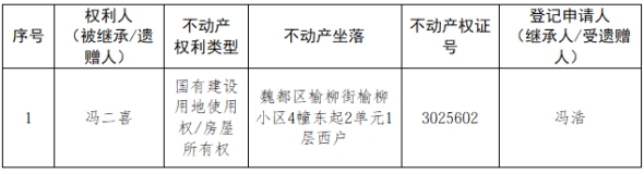 根据《不动产登记暂行条例实施细则》第十四条的规定,经初步查验,不动产登记机构拟对下列不动产权利办理不动产继承登记。根据《不动产登记暂行条例实施细则》第十七条的规定,现予公告。如有异议,请自本公告之日起15个工作日内,将异议书面材料送达不动产登记机构。逾期无人提出异议或者异议不成立的,不动产登记机构将予以登记。