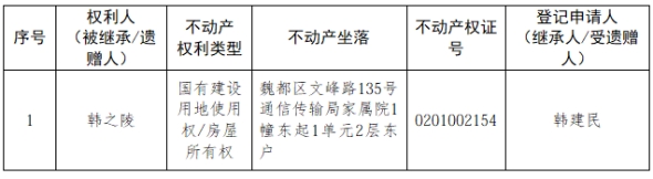根据《不动产登记暂行条例实施细则》第十四条的规定,经初步查验,不动产登记机构拟对下列不动产权利办理不动产继承登记。根据《不动产登记暂行条例实施细则》第十七条的规定,现予公告。如有异议,请自本公告之日起15个工作日内,将异议书面材料送达不动产登记机构。逾期无人提出异议或者异议不成立的,不动产登记机构将予以登记。