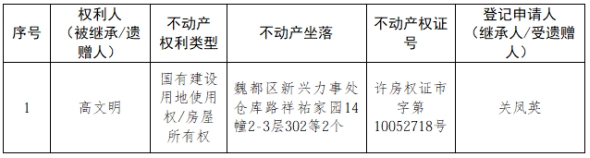 根据《不动产登记暂行条例实施细则》第十四条的规定,经初步查验,不动产登记机构拟对下列不动产权利办理不动产继承登记。根据《不动产登记暂行条例实施细则》第十七条的规定,现予公告。如有异议,请自本公告之日起15个工作日内,将异议书面材料送达不动产登记机构。逾期无人提出异议或者异议不成立的,不动产登记机构将予以登记。
