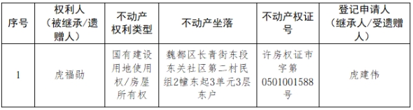 根据《不动产登记暂行条例实施细则》第十四条的规定,经初步查验,不动产登记机构拟对下列不动产权利办理不动产继承登记。根据《不动产登记暂行条例实施细则》第十七条的规定,现予公告。如有异议,请自本公告之日起15个工作日内,将异议书面材料送达不动产登记机构。逾期无人提出异议或者异议不成立的,不动产登记机构将予以登记。