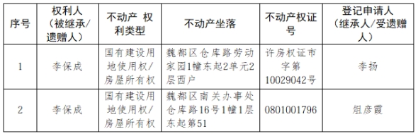 根据《不动产登记暂行条例实施细则》第十四条的规定,经初步查验,不动产登记机构拟对下列不动产权利办理不动产继承登记。根据《不动产登记暂行条例实施细则》第十七条的规定,现予公告。如有异议,请自本公告之日起15个工作日内,将异议书面材料送达不动产登记机构。逾期无人提出异议或者异议不成立的,不动产登记机构将予以登记。