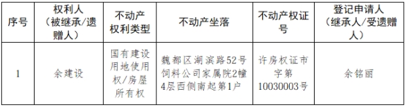 根据《不动产登记暂行条例实施细则》第十四条的规定,经初步查验,不动产登记机构拟对下列不动产权利办理不动产继承登记。根据《不动产登记暂行条例实施细则》第十七条的规定,现予公告。如有异议,请自本公告之日起15个工作日内,将异议书面材料送达不动产登记机构。逾期无人提出异议或者异议不成立的,不动产登记机构将予以登记。