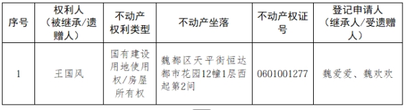 根据《不动产登记暂行条例实施细则》第十四条的规定,经初步查验,不动产登记机构拟对下列不动产权利办理不动产继承登记。根据《不动产登记暂行条例实施细则》第十七条的规定,现予公告。如有异议,请自本公告之日起15个工作日内,将异议书面材料送达不动产登记机构。逾期无人提出异议或者异议不成立的,不动产登记机构将予以登记。