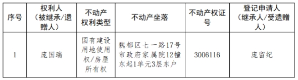 根据《不动产登记暂行条例实施细则》第十四条的规定,经初步查验,不动产登记机构拟对下列不动产权利办理不动产继承登记。根据《不动产登记暂行条例实施细则》第十七条的规定,现予公告。如有异议,请自本公告之日起15个工作日内,将异议书面材料送达不动产登记机构。逾期无人提出异议或者异议不成立的,不动产登记机构将予以登记。
