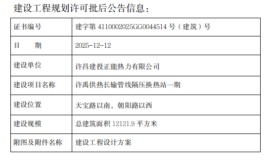 许禹供热长输管线隔压换热站一期建设工程规划许可批后公告