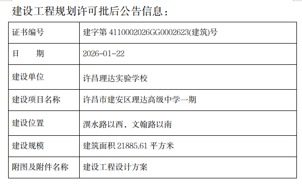 许昌市建安区理达高级中学一期建设工程规划许可批后公告