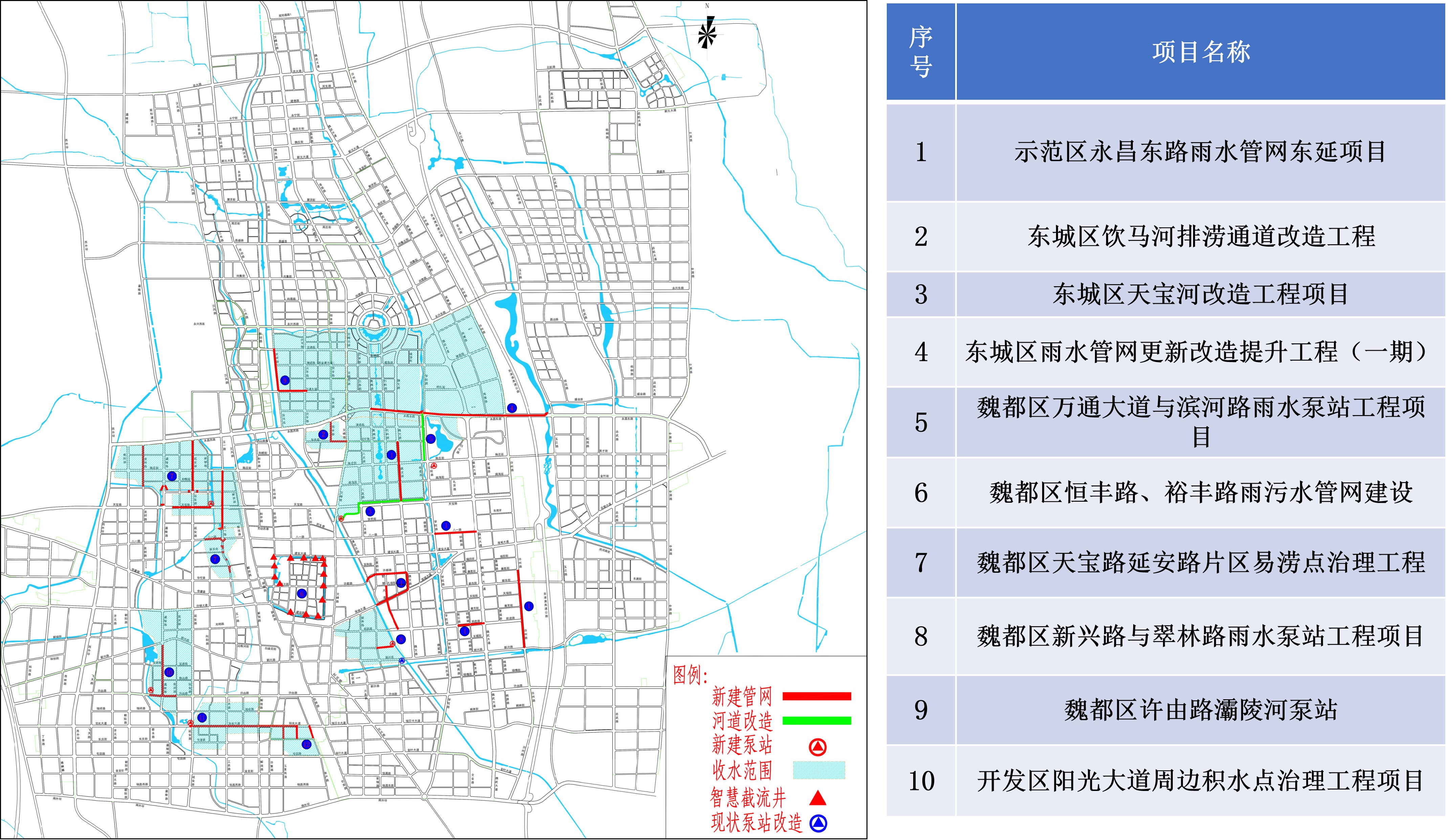 涉及龙祥路、灞陵路、延安路玉龙街、天宝路、五一路、八一路等雨水系统的管道新建及改造。新建雨水管涵约5000米;新建一体化雨水泵站一座,设计排水能力2.4立方米/秒。